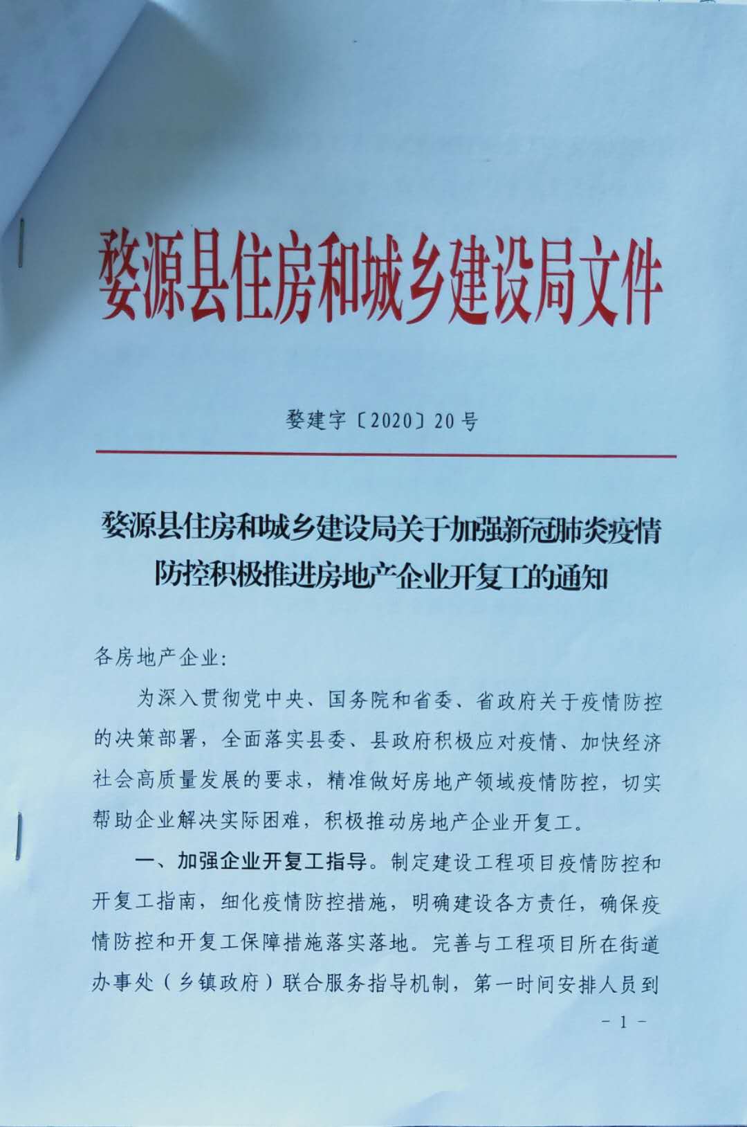 关于加强新冠肺炎疫情防控积极推进房地产企业开复工的通知